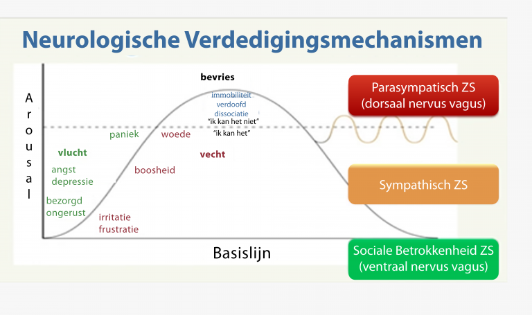 Na een trauma wordt de wereld ervaren via een ander zenuwstelsel, dat andere inschattingen maakt van risico’s en veiligheid. We zullen hierbij in het kort stilstaan bij de anatomische opmaak van de nervus vagus, want die is essentieel voor het begrip van de manier waarop mensen omgaan met hun trauma. Elke bedreiging van onze veiligheid/sociale verbindingen activeert wijzigingen in die gebieden, die gestimuleerd worden door de nervus vagus. Het autonome zenuwstelsel regelt drie fundamentele fysiologische toestanden. De mate van veiligheid bepaalt welke van deze drie toestanden op enig moment worden geactiveerd.